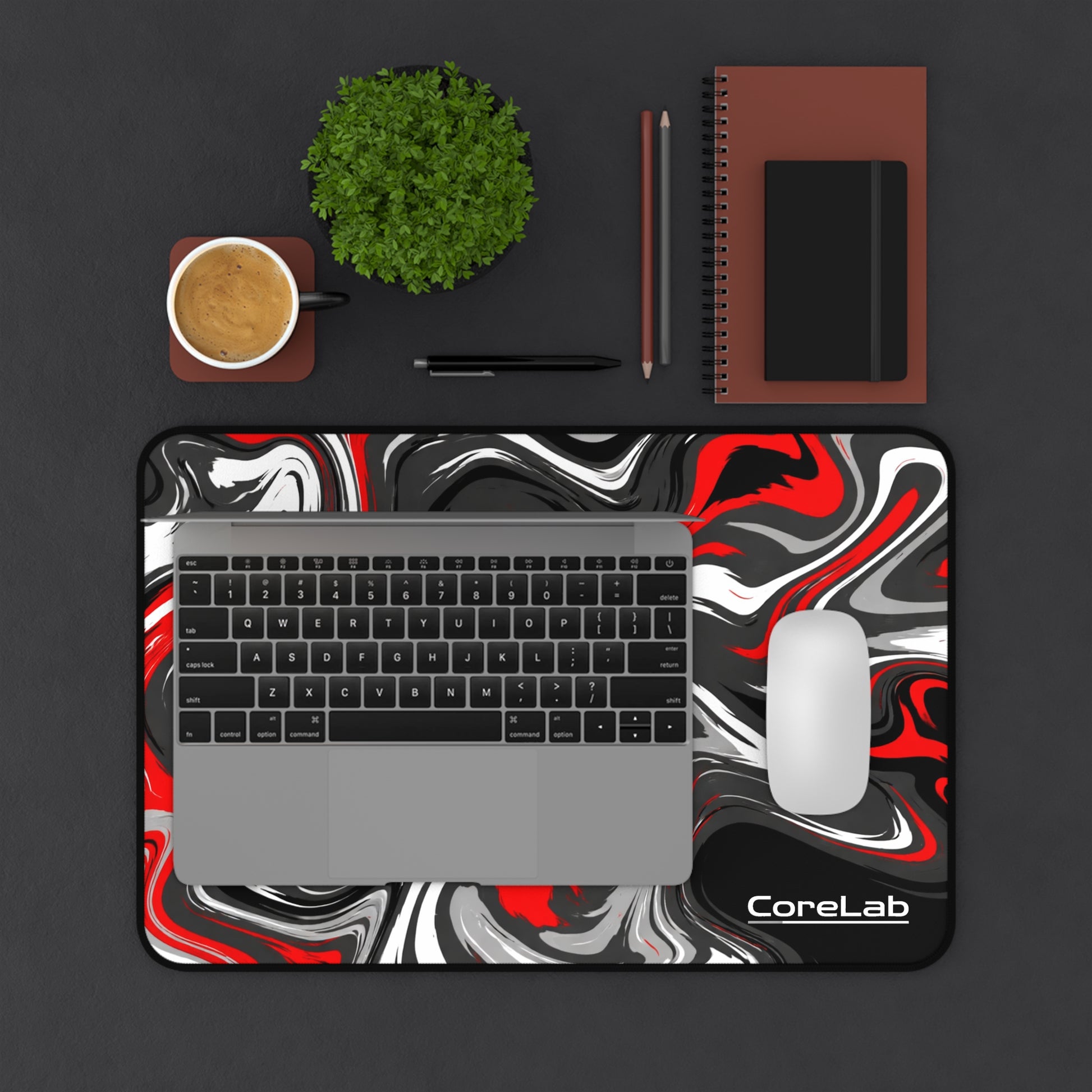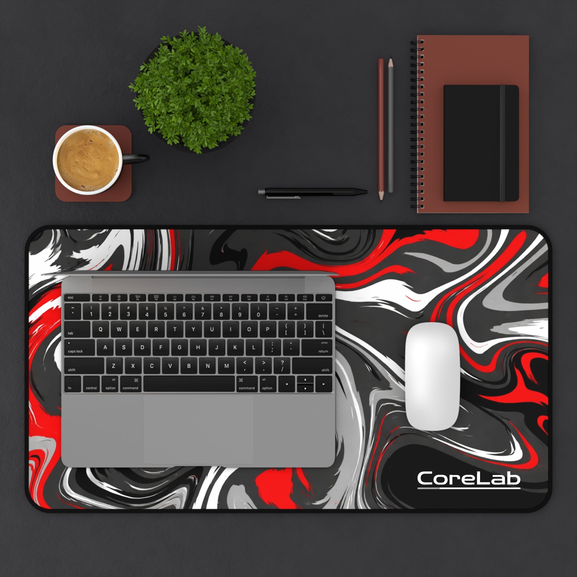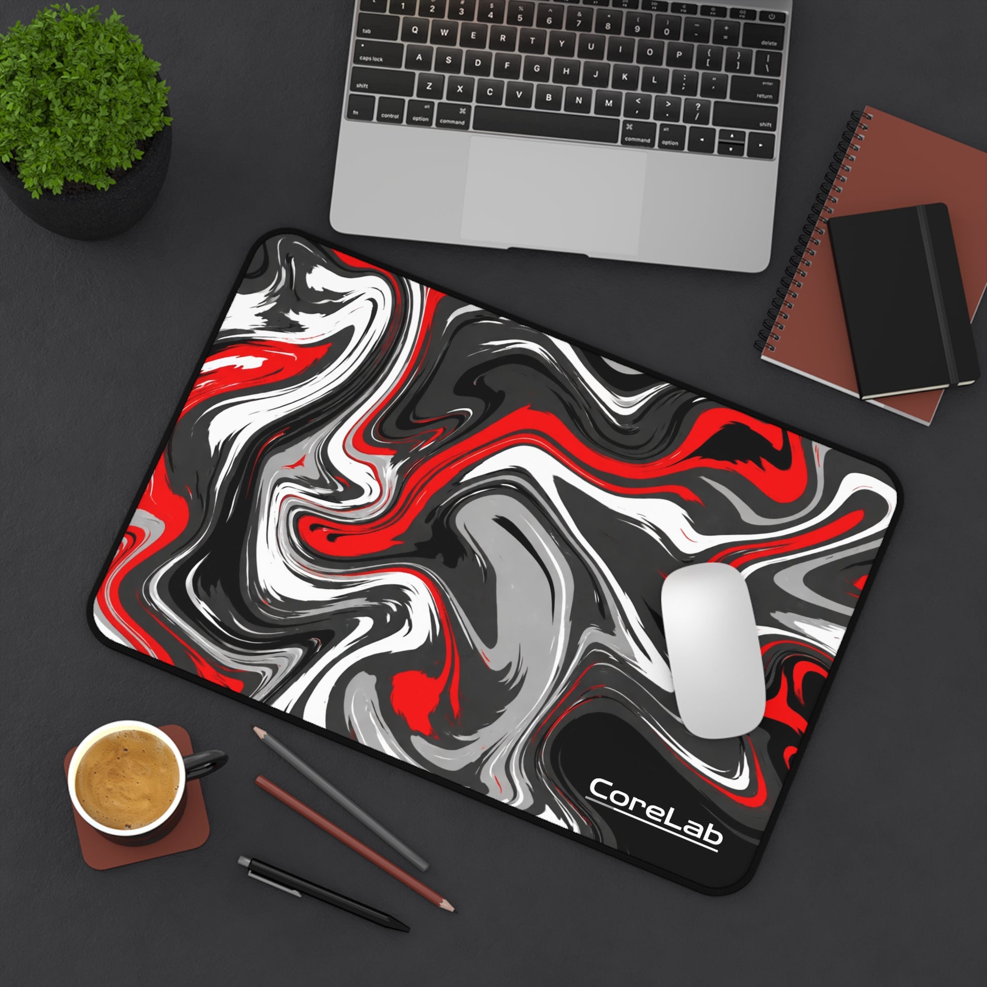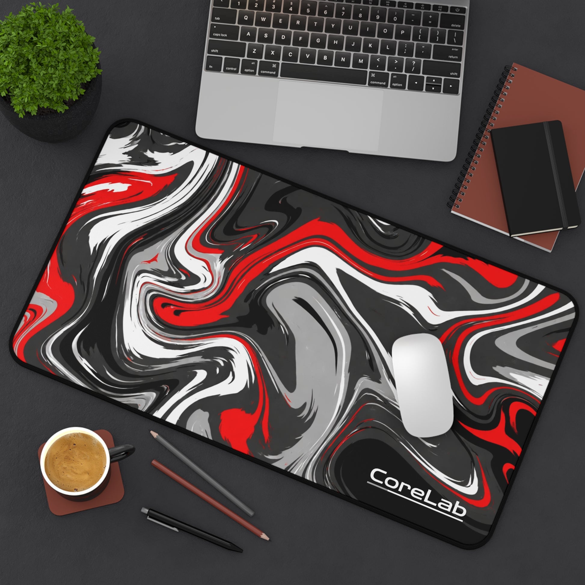 A bold, color-popping desk mat that brings motion and focus to your workspace. The swirling red, black, white and gray pattern reads like poured paint — energetic and a little rebellious — so your desk never feels boring. Made from smooth neoprene with stitched edges and an anti-slip underside, it stays steady through long typing sessions, sketching marathons, or frantic late-night coffee-fueled sprints. Fits cleanly under keyboards, laptops, or drawing tablets and adds a creative pulse to home studios, gaming rigs, and office corners.